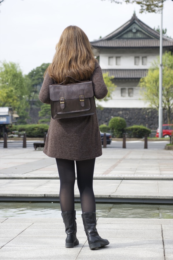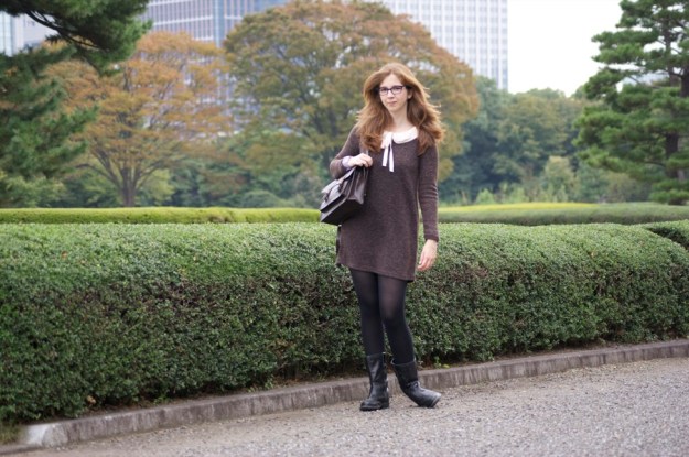 El que elegí para mi paseo por los jardines imperiales es uno muy sencillo, suelto, marrón de lana y manga larga con el cuello Beige. Como ese día tenía mucho que caminar y mucho que ver, elegí las botas Camper estilo motero, unas medias negras y otra estrella de estos días en Japón, el bolso «three ways». Un bolso que puedes llevar como cartera de mano, como mochila de cole y en el hombro.