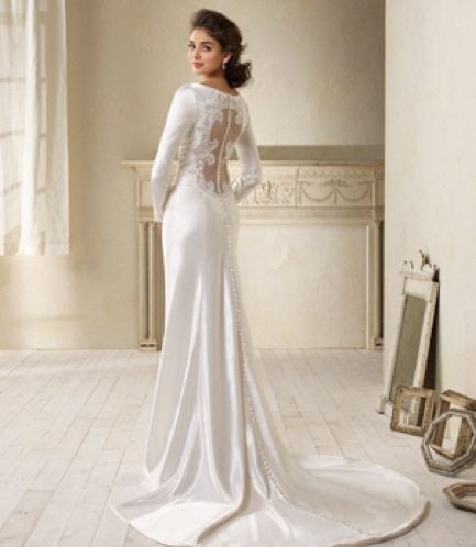 El vestido es muy sencillo pero a la vez perfecto, eso sí, muy sexy. Es de manga larga, tiene una gran apertura en la espalda con encaje y está hecho de satén con una fila de botones cubiertos por toda la espalda y por toda la cola del vestido.