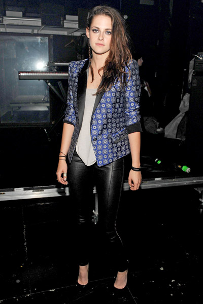 Kristen Stewart nunca gusta a todo el mundo, pero esta vez ha recibido muchas alabanzas con su estilismo de inspiración masculina. Lleva una camiseta gris con unos pantalones de cuero negro ajustados y la prenda estrella, la chaqueta de Roberto Cavalli Resort 2013.