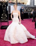 Jennifer Lawrence se llevó el Oscar a mejor actriz por El Lado bueno de las cosas. La vimos impresionante con un vestido satinado de Christian Dior Haute Couture palabra de honor de seda. Uno de los detalles más curiosos es que Jennifer se atrevió con la nueva tendencia en joyería y lució un collar Chopard en la espalda. Sus smokey eyes y su maquillaje fresco y joven, eran el contraste perfecto con el voluminoso vestido que tenía un toque muy serio.