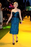 Michelle Williams escogió un vestido Burberry azul y verde brillante adornado con plumas de pavo real y un bustier bordado. El color resaltaba muchísimo en la alfombra de color amarillo del evento. Las sandalias son de Jimmy Choo y su corte pixie cada día me gust más. Esta vez lo lleva peinado hacia el lado con muchísima gracia.