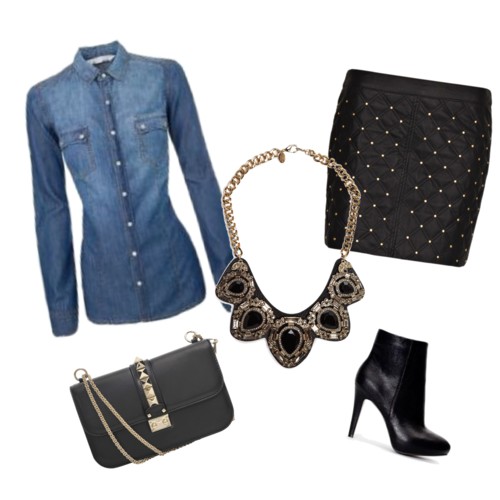 Sea el modelo que sea lo podemos combinar casi con cualquier cosa, desde aquí os proponemos un estilismo para un viernes noche, combinando la camisa vaquera con otros dos imprescindibles de esta temporada, el cuero y los maxicollares. El cuero lo vamos a llevar en una falda con tachuelas, y vamos a añadir el maxicollar, collares que se encuentran en casi todas las tiendas y que a mí, por lo menos, me encantan, ya que hacen que un look casual se convierta en un look elegante y chic.