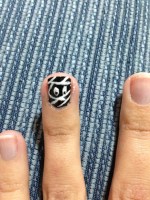 Y para nuestra uña momia, simplemente habrá que utilizar los mismos accesorios que en la que lleva los ojos para dibujar unas líneas al azar y como mas nos gusten dejando un huequito para dibujar dos círculos, que serán los ojos de nuestra momia. Una vez secado repetimos el mismo paso que en la uña anterior y dibujamos dos puntitos negros en los dos círculos blancos.