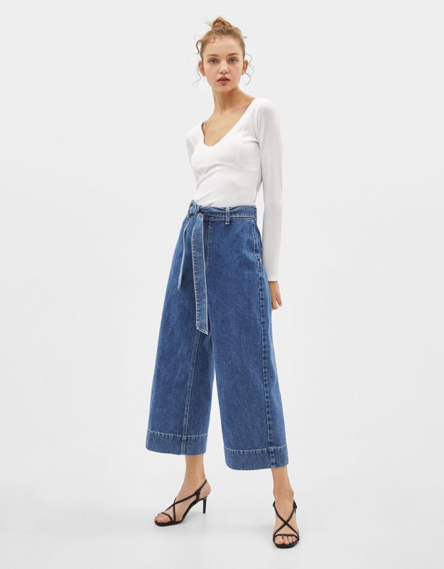 El vaquero es un tejido muy fácil de llevar. En el caso del pantalón culotte es muy combinable. Si elegimos, por ejemplo, una camiseta blanca de manga larga o tirantes podemos tener un look básico muy interesante.