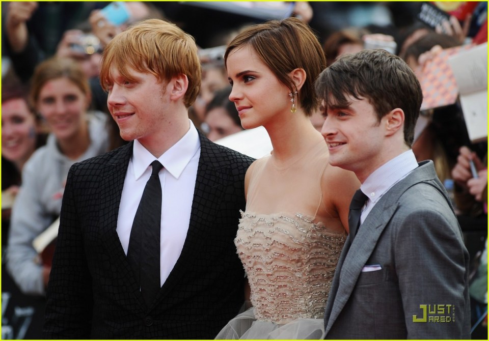 LONDON, ENGLAND – JULY 07: (L-R) Rupert Grint, Emma Watson and Daniel Radcliffe attend the World Premiere of Harry Potter and The Deathly Hallows – Part 2 at Trafalgar Square on July 7, 2011 in London, England. (Photo by Ian Gavan/Getty Images)