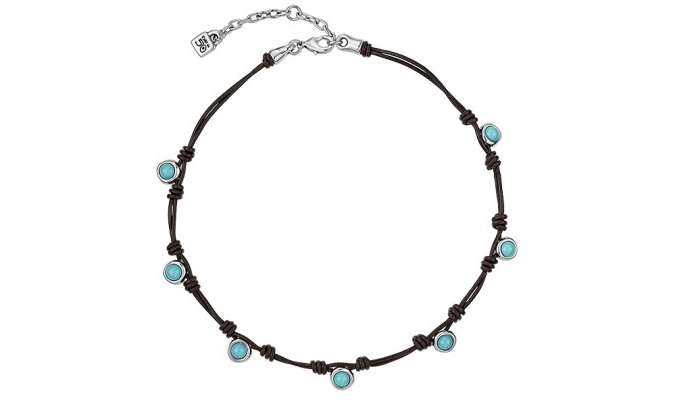 Gargantilla con dos vueltas de cuero con siete piezas bañadas en plata con cristales de Murano en color turquesa separadas por dos nudos de cuero 69€